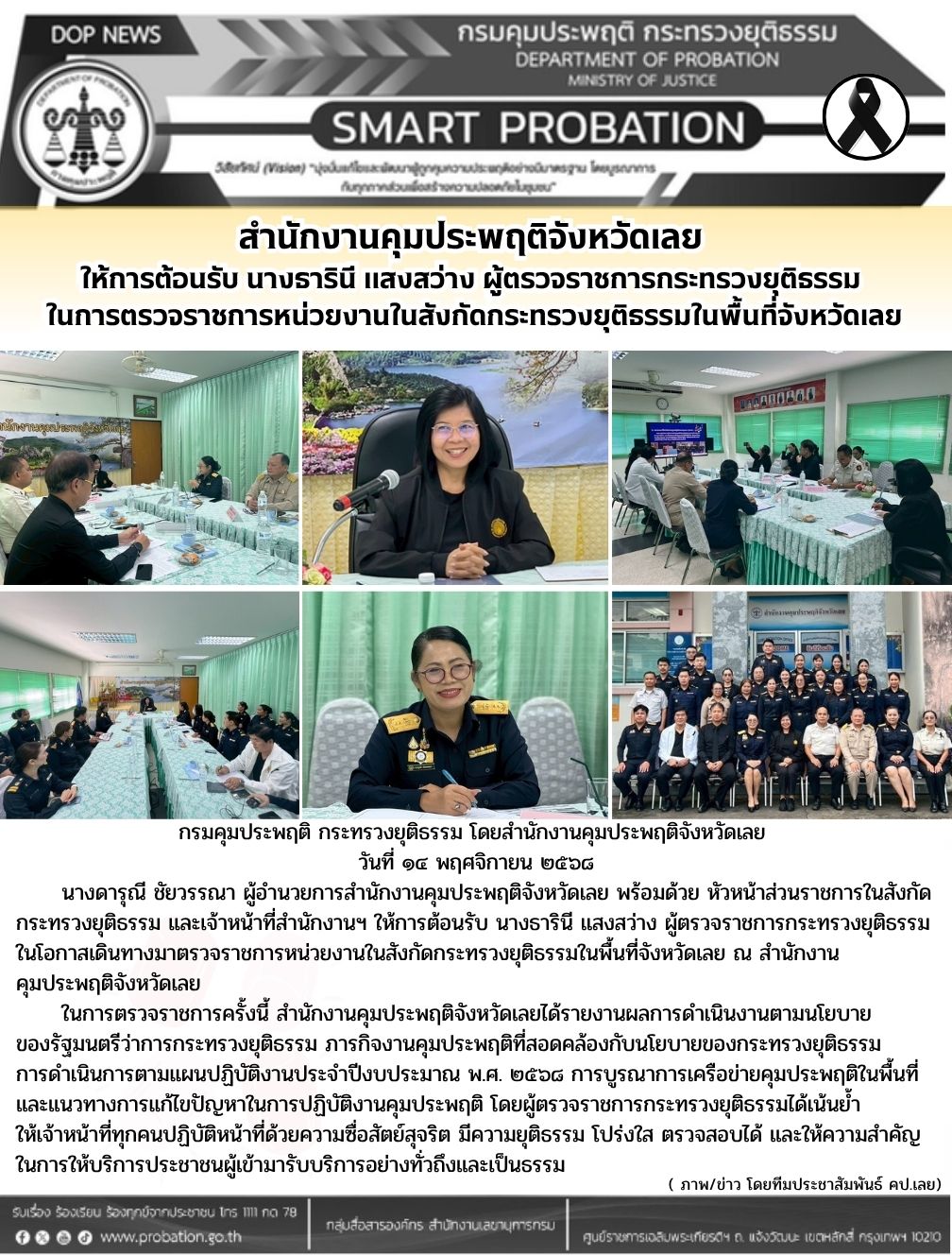 สำนักงานคุมประพฤติจังหวัดเลย ให้การต้อนรับ นางธารินี แสงสว่าง ผู้ตรวจราชการกระทรวงยุติธรรม ในโอกาสเดินทางมาตรวจราชการหน่วยงานในสังกัดกระทรวงยุติธรรมในพื้นที่จังหวัดเลย