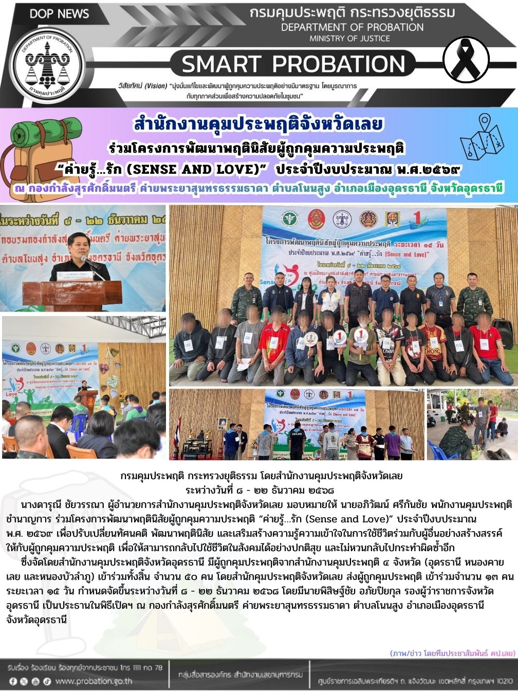สำนักงานคุมประพฤติจังหวัดเลย ร่วมโครงการพัฒนาพฤตินิสัยผู้ถูกคุมความประพฤติ “ค่ายรู้…รัก (Sense and Love)” ประจำปีงบประมาณ พ.ศ. ๒๕๖๙