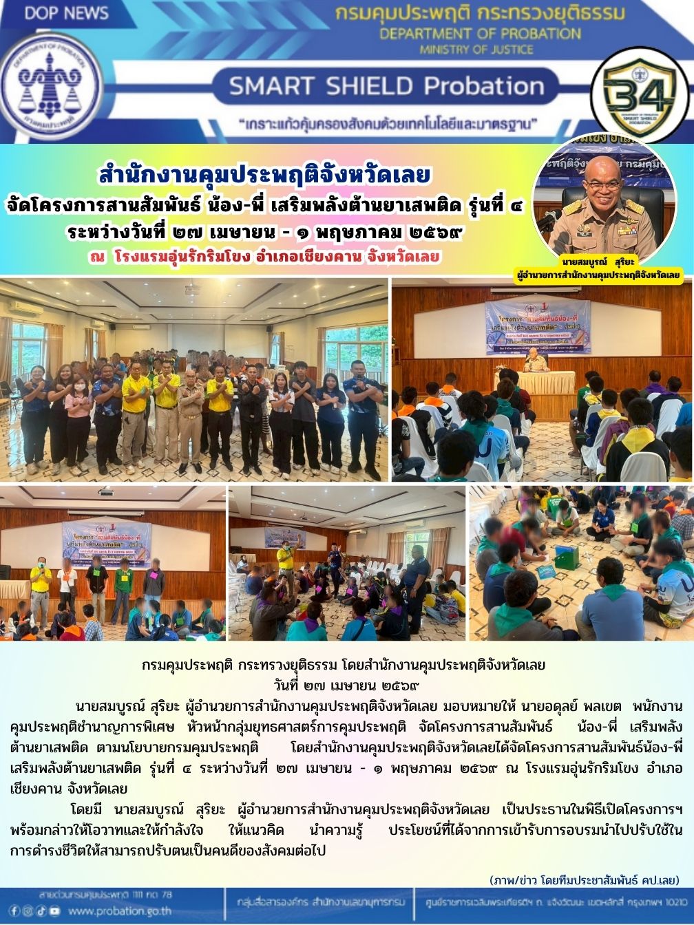 สำนักงานคุมประพฤติจังหวัดเลย จัดโครงการสานสัมพันธ์ น้อง-พี่ เสริมพลังต้านยาเสพติด รุ่นที่ ๔ ระหว่างวันที่ ๒๗ เมษายน - ๑ พฤษภาคม ๒๕๖๙ ณ โรงแรมอุ่นรักริมโขง อำเภอเชียงคาน จังหวัดเลย